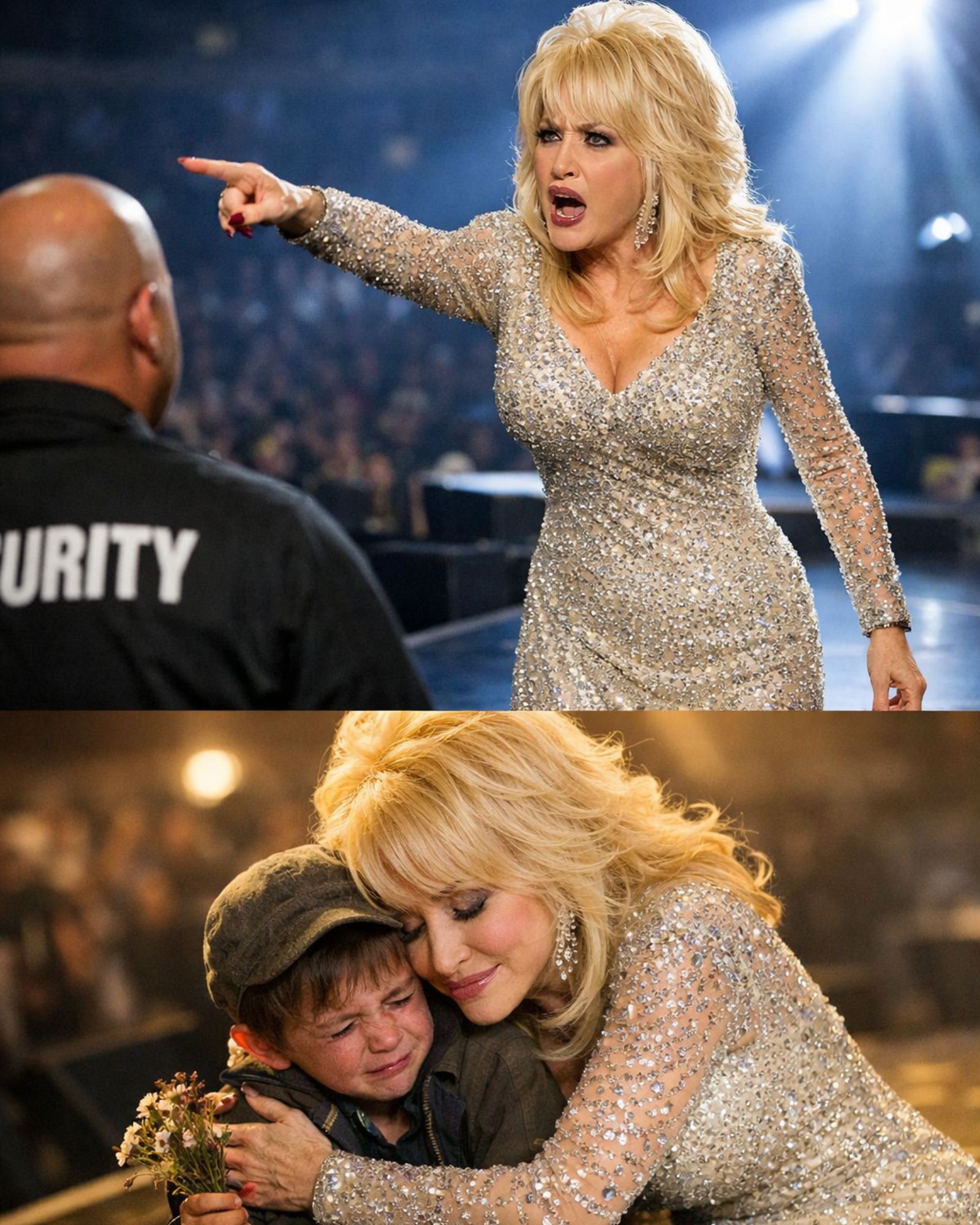 And then the scene tightens, turning a stadium into a small, human moment: A scruffy little boy, clutching a bouquet of wilted wildflowers, was being blocked by security for not having a ticket. Instead of continuing to sing, Dolly marched straight to the edge of the stage and signaled the band to silence.