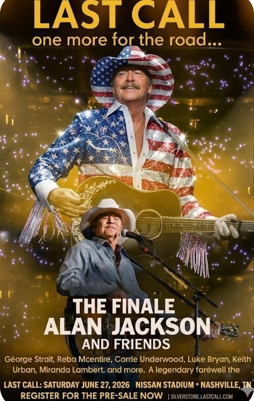 There are concerts, and then there are milestones so large they seem to gather an entire lifetime into a single night. That is why HISTORIC NEWS: Alan Jackson announces “Last Call: One More for the Road — The Finale” — his ultimate farewell concert set for June 27, 2026, at Nissan Stadium, Nashville. A once-in-a-lifetime celebration honoring over four decades of country music greatness. does not read like ordinary promotion. It reads like the closing line of an American story that has been sung across highways, honky-tonks, arenas, and family living rooms for generations. Alan Jackson’s official site and Nissan Stadium both describe Last Call: One More for the Road – The Finale as the last full-length concert of his touring career, scheduled for Saturday, June 27, 2026, at Nissan Stadium in Nashville.