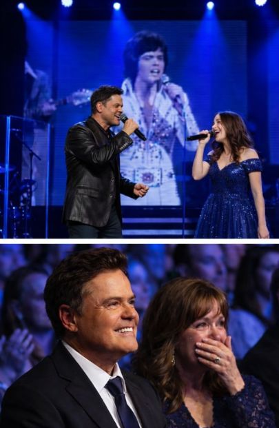 It didn’t feel like a concert so much as a quiet family moment shared by thousands—and that distinction matters. A concert is often about control: pacing, polish, the “right” moments on cue. But what you’re describing has the texture of truth. Donny Osmond, seated beneath the soft glow of stage lights, becomes less the performer and more the witness. You can almost hear the room lean in—not because the volume rises, but because the meaning does. For longtime fans, especially those who have followed Donny through decades of television, touring, and that uniquely public journey of growing up in front of the world, the image is striking: a man whose voice has carried so many rooms now choosing to let silence speak.