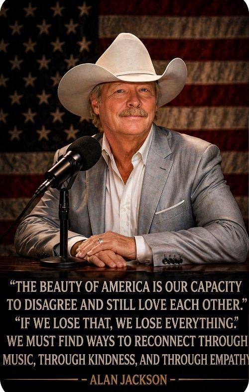 There are moments in public life when a familiar voice suddenly carries a different kind of weight. Not because it has changed, but because the world around it has. For decades, Alan Jackson has been known as one of country music’s most steady and recognizable voices — a man whose songs carried the language of small towns, front porches, heartbreak, faith, memory, and the quiet dignity of ordinary people. He never needed to shout to be heard. That has always been part of his power. And now, in a television interview that has stirred strong emotion across the country, that same calm presence seems to be speaking not only to fans of country music, but to Americans who feel unsettled, divided, and deeply uncertain about where the nation is heading.