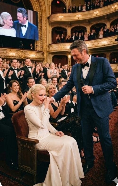 Last night, Blake Shelton delivered a deeply emotional performance — a personal tribute to his wife, Gwen Stefani, who watched quietly from the audience. That image alone is enough to stir the imagination: Blake onstage, steady and sincere, and Gwen sitting quietly among the crowd, not as a fellow star in that moment, but as the woman receiving something deeply personal. It is this contrast that gives the scene its power. One of the most recognizable voices in country music was not performing for headlines or spectacle. He was singing with gratitude, tenderness, and the kind of feeling that cannot be imitated.