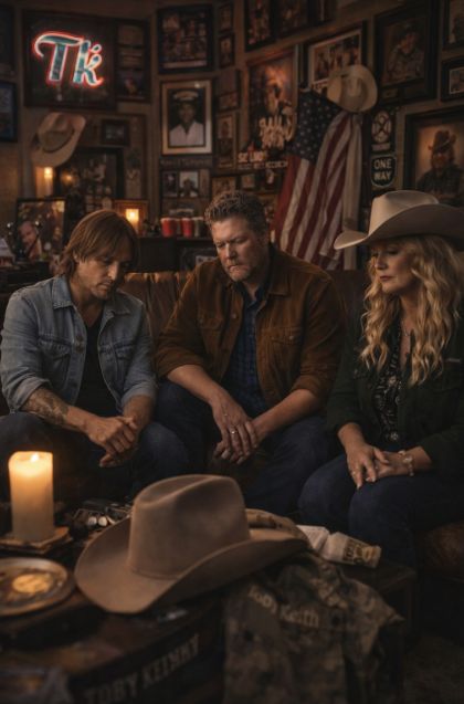 That is why this imagined farewell feels so powerful. Not because it is loud, but because it is not. “No Stage, No Applause — The Night Blake Shelton, Keith Urban, and Miranda Lambert Sang Goodbye to Toby Keith in Silence” draws its emotional force from restraint. There is no roaring audience here, no dramatic production, no carefully timed curtain call. Instead, we are given something far more moving: three artists, each successful in their own right, returning not as stars but as friends. That difference matters. It changes the entire meaning of the moment.